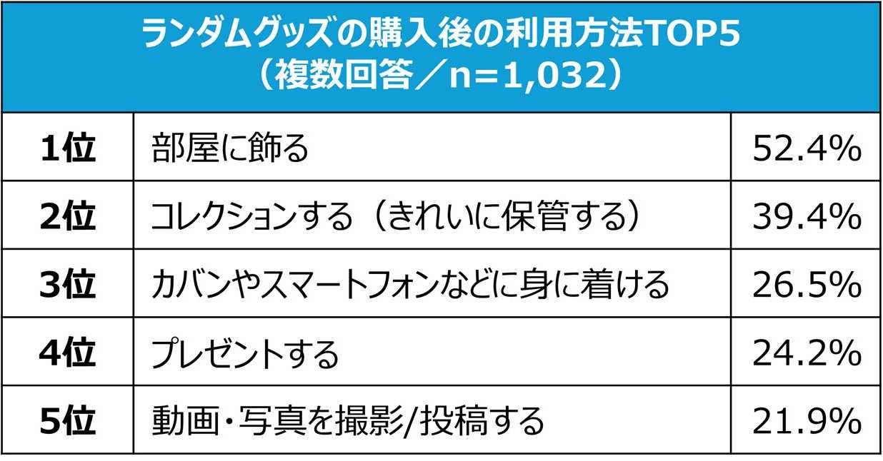 ランダムグッズの購入後の楽しみ方について、「部屋に飾る」が52.4%と最も多い結果になりました。次いで「コレクションする(きれいに保管する)」が39.4%、「カバンやスマートフォンなどに身に着ける」が26.5%と、使用用途に合った利用が9割弱にのぼり、体験として楽しまれた後もランダムグッズは“生活の一部”として楽しまれていることがわかりました。