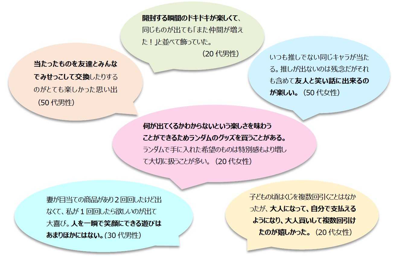 ランダムグッズに関する思い出やエピソードを自由回答で尋ねたところ、開封する瞬間のワクワク感や非日常感を楽しむ声のほか、家族や友人と中身を開けて喜びを共有した体験、子どもの頃にはできなかった“大人買い”を楽しむ声などが寄せられました。ランダムグッズならではの「何が出るかわからない楽しさ」が、印象的な思い出として残っている様子がうかがえます。