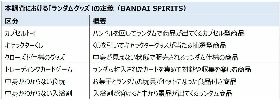 本調査では、内容物はそれぞれ異なるものの「何が当たるかわからない体験」を提供する商品として、カプセルトイ/キャラクターくじ/クローズド仕様のグッズ/トレーディングカードゲーム/中身がわからない食玩/中身がわからない入浴剤の6カテゴリーを「ランダムグッズ」と定義し、実態を調査しました。