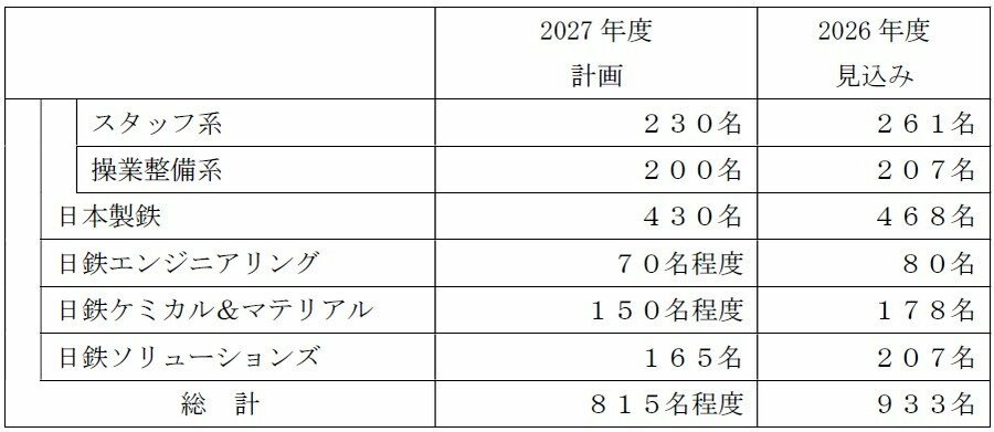 日本製鉄株式会社(以下、日本製鉄)および事業セグメント会社における2027 年度の採用計画について、以下の通り決定いたしましたので、お知らせいたします。