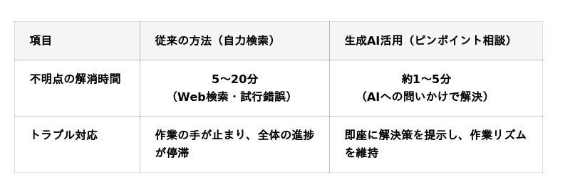 6台並行していれば、必ず1台はマニュアル通りにいかない「個体差」や「エラー」を吐き出します。1台のトラブル調査で手が止まれば、残りの5台は放置され、作業効率は劇的に低下します。今回、AIを「即時回答のパートナー」とすることで、この連鎖的な停滞を低減することに成功しました。