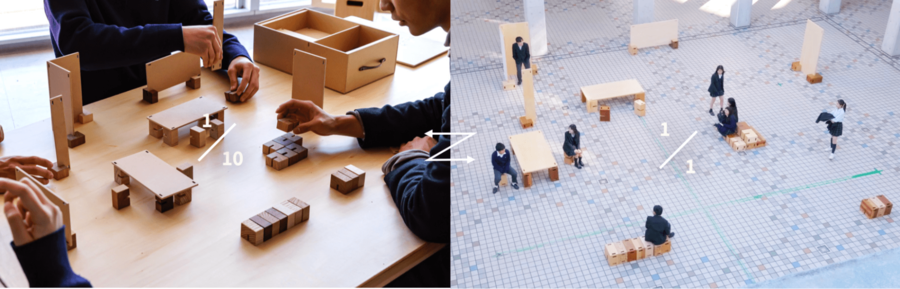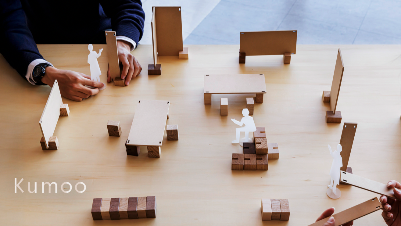 Kumoo(クモー)は、「主体性や探求心などを育む教育」への転換が進む学校教育現場に向けた体験型コミュニケーションツールです。もともとはパーテーション制作のご相談を受けたことから始まり、現在の教育現場の課題を踏まえた上で、より適したカタチを考案しました。Kumooの名前は「kumoo=組もう」に由来し、生徒たちが自由に組み立て、創造する喜びを実感できるように設計されています。Kumooは、まず10分の1サイズの模型でアイデアを試し、次に実物スケールで空間を再構築するプロセスを通じて、思考から実践への流れを自然に育み、生徒の「やりたい」という好奇心を醸成し実現することができます。