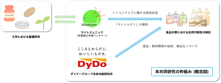 ダイドーグループホールディングス株式会社(本社:大阪市北区、代表取締役社長:髙松 富也、以下「当社」)が2025年3月21日に設置した「ダイドーグループ未来共創研究所」(以下「本研究所」)は、学習院大学発ベンチャーの株式会社マイトジェニック(本社:東京都新宿区、代表取締役:谷若 慶人、以下「マイトジェニック」)と、ミトコンドリア活性化成分「マイトルビン」を活用した食品開発に向け、2026年3月より本研究所初となる共同研究を開始しましたので、お知らせいたします。