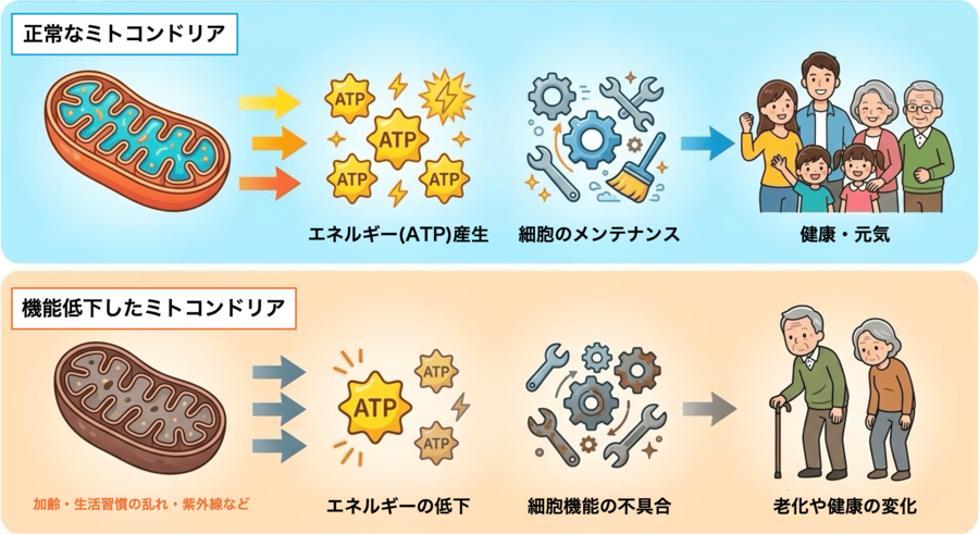 ミトコンドリアは、生命維持に必要なエネルギーを産生する重要な細胞小器官であり、細胞が正常に働き続けるために欠かせない役割を担っています。しかし、加齢やさまざまな要因によりミトコンドリア機能が低下すると、エネルギーの低下や活性酸素種の増加、細胞内の品質管理の乱れなどが生じ、老化および老化に関連するさまざまな疾患を誘発することが知られています。