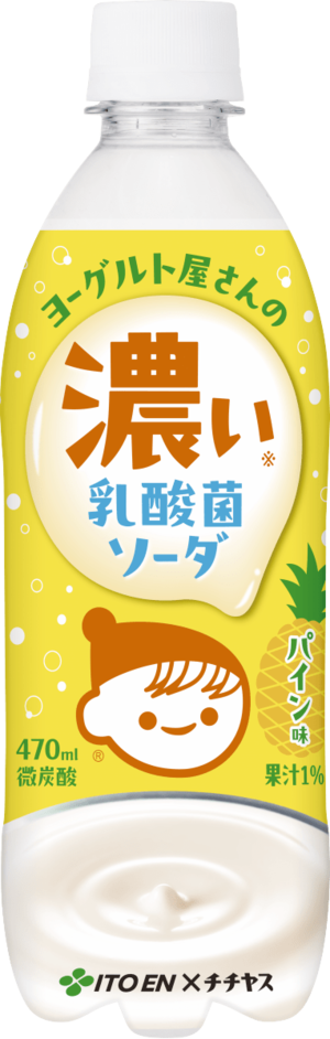 「チチヤス ヨーグルト屋さんの濃い乳酸菌ソーダ パイン味」は、チチヤス独自の乳酸菌「ST-9618」を含有しており、いつでも乳酸菌をおいしく手軽に摂取いただける濃厚なパイン味の炭酸飲料です。パッケージには愛らしいチー坊が目をひくデザインをあしらいました。