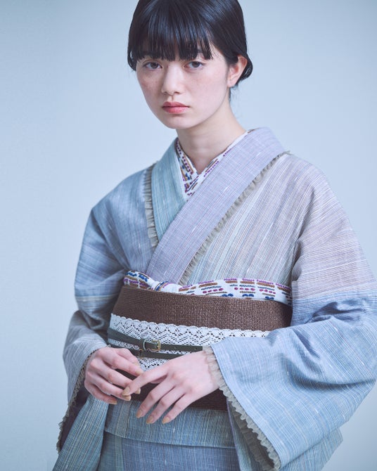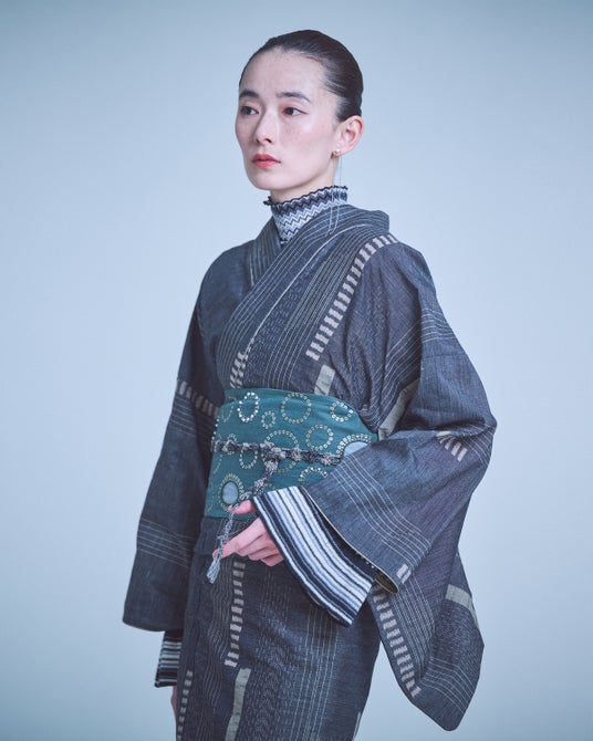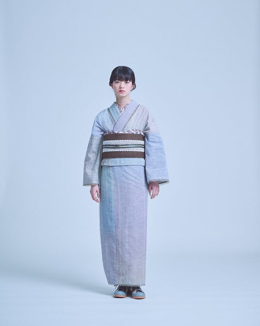 緯糸にはトップ染めの糸を使用し、デニムのようなラフな表情でありながら、平織りの上品な質感もあわせ持っています。また麻糸を使用することで軽やかな着心地に仕上げ、縞や格子とは異なる新しい夏きものの表現に挑戦しています。