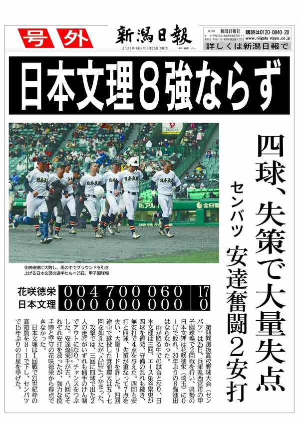 【号外】センバツ高校野球、日本文理8強ならず 2026/3/25 15:12 PDFで号外を見る トップページで最新情報を見る 関連ニュース [フィギュア世界選手権]今夜いよいよ女子SP!初出場の中井亜... 16:45 女子スノボクロス・吉田蓮生選手が母校の湯沢中学校で講演 ミラ... 11:45 【センバツ高校野球】日本文理、0-17で花咲徳栄に敗れる 2... 9:00 [卓球・全国高校選抜大会]新潟産業大付属が男子団体5位!1年... 3/24 [フィギュア世界選手権]中井亜美、公式練習「いい感じ」 坂本... 3/24 レスリングU23全日本、本名一晟(新潟市西蒲区出身)が優勝 ... 3/24 [アルビレックス新潟]代表活動で主力DF2人が不在、チャンス... 3/24 【センバツ高校野球】日本文理、25日いよいよ2回戦!花咲徳栄... 3/24 横綱大の里への糸魚川市民栄誉賞、すでに贈られていた…相撲協会... 3/24 [ソフトテニス都道府県対抗中学生大会]新潟県選抜、熱戦へ気合... 3/24 [フィギュア世界選手権]中井亜美「思い切りやれたらいい」 日... 3/23 スノボHP「ザ・スノーリーグ」第1シーズン覇者の冨田せな(妙... 3/23