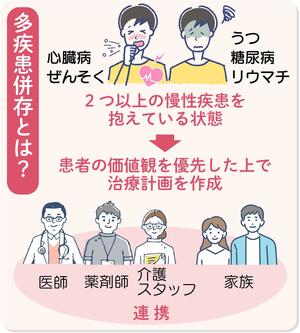 多疾患併存を簡単に言うと、「一人の患者が、二つ以上の慢性疾患を抱えている状態」です。例えば、気管支ぜんそくと心臓病がある、うつ病と糖尿病と関節リウマチを患っている、血液透析中の腎臓病患者に大腸がんが発症し長期の治療が必要となる-などです。全患者の20%以上、65歳以上だと60%以上の割合と言われています。当てはまる人もいらっしゃるのではないでしょうか。