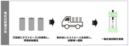 この取り組みにより、従来行っていたコンクリートの強度を確認する試験用サンプル(テストピース)の採取や、試験場での強度試験(圧縮試験)が不要となるため、施工管理者の業務効率化につながります。また、全国運用後には、年間約108トンのテストピース廃棄物の削減が可能となり、環境負荷低減にも貢献します。