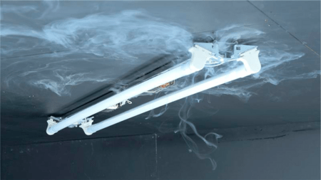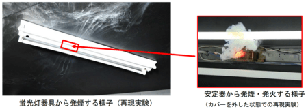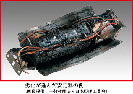 蛍光灯器具は、単なる「ランプの取付け台」ではなく、安定器や内部配線などの電気部品を内蔵した「電気製品」であるため、外観に異常が見られなくても内部では劣化が進行している場合があります。特に、器具内の安定器は長年の使用により絶縁性能が低下することがあり、その結果、発煙や発火などの事故に至るおそれがあります。