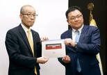 防衛省沖縄防衛局の村井勝局長(右)に意見書を手渡す沖縄県宜野湾市議会の呉屋等議長=26日午後、嘉手納町
