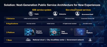 このソリューションは、各国がデジタルインフラ、データプラットフォーム、およびAI搭載アプリケーションを使用して、いかに公共サービス提供を近代化できるかという青写真を提供します。その中核となるのは「1つのデジタル基盤+1つのインテリジェント・プラットフォーム+N個の業界アプリケーション」という概念に基づいて構築されたアーキテクチャであり、複数のチャネルにわたってシームレスで効率的、かつアクセスしやすいサービス環境を構築することを目指しています。