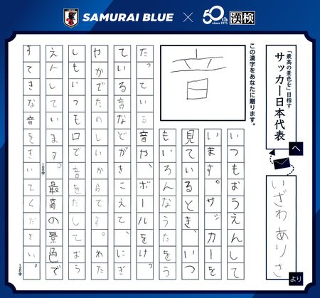 生涯スポーツとしてのサッカーと生涯学習としての日本語・漢字の振興を通じてスポーツと学びの楽しさや喜びを伝えていくことを目的に取り組むものです。FIFAワールドカップ2026に向けたSAMURAI BLUE(サッカー日本代表)の合言葉「最高の景色を2026 FOR OUR GREATEST STAGE」とも連動し、年間を通じてSAMURAI BLUEを応援する特別コラボ企画を行っています。