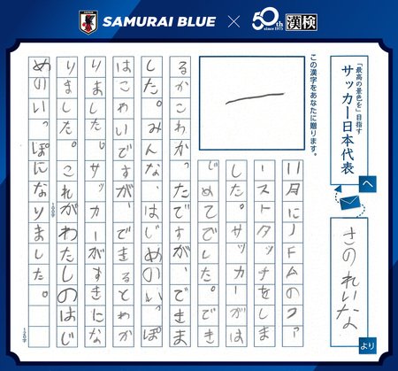日本サッカー協会(JFA)と公益財団法人 日本漢字能力検定協会(本部:京都市東山区/代表理事:山崎信夫/以下、漢検協会)が2025年6月から実施しているコラボレーション企画「全力蹴球プロジェクト」。その取り組みのひとつである「今、あなたに贈りたい漢字コンテスト『SAMURAI BLUEを応援しようキャンペーン!』」の受賞作品が決定しました。