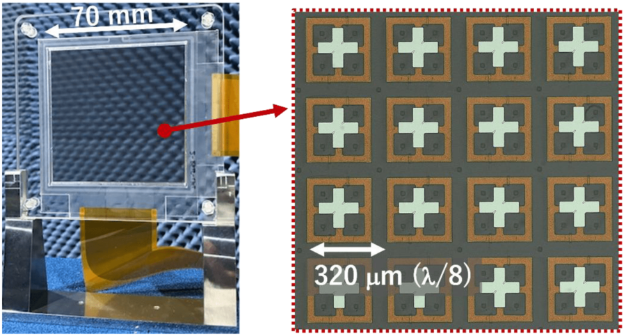 これらの技術的ポイントを採用した世界最薄の液晶層(3.5mm)を有する透過型液晶メタサーフェスをサブテラヘルツ帯(115GHz)で試作しました(図3)。