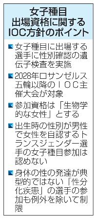 IOCは男性の方がランニングや競泳で10~12%、投てきや跳躍種目で20%超の身体的優位性を持つとのデータを提示。女子種目の参加資格は「生物...