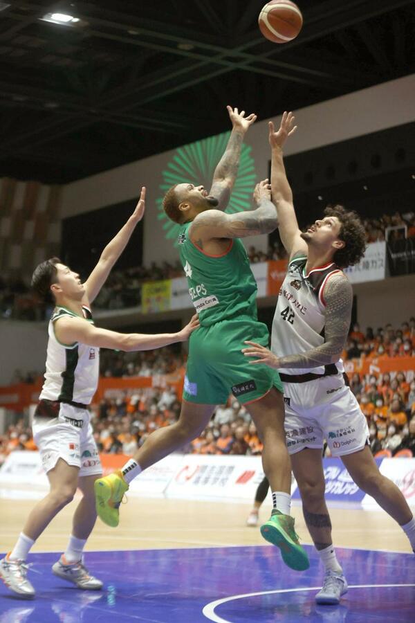 新潟の先発はフェルプス、長谷川智伸、五十嵐圭、濱田貴流馬、ムトンボ。第2クオーターで一時8点リードしたが、相手に速攻を許すなどし、31-30で前半を終えた。