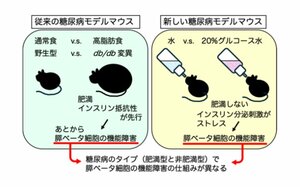 (左)従来から利用されてきた糖尿病モデルマウス。肥満やインスリン抵抗性が起きたあとで膵ベータ細胞の機能障害が生じる。