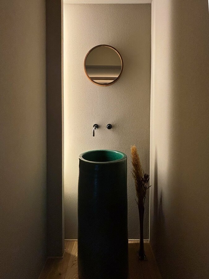 モデルハウスを手がけるのは初めてという匠だが、さてどのような空間づくりを行なったのだろうか。まずデザイン面では、信楽という土地の歴史や文化を巧みに取り入れたという。たとえば、外構には地元の「長石」を敷き詰め、外壁の塗り壁は信楽の土の質感をイメージ。玄関を開ければ、まるで風景画のような窓の仕掛け。さらに、特注の信楽焼の洗面ボウルや、真鍮を用いたオーダーキッチンなど、細部にまで「一点物」へのこだわりを凝縮させた。それは地元の芸術家や移住者が多い町において、森工務店の「感性」を伝える重要なメッセージとなっている。しかし、本質はデザインだけではない。特筆すべきはその性能。大きな開口部を設けながらも、外断熱と内断熱を組み合わせた付加断熱により、UA値0.39という断熱性能を実現。かつては冬場の光熱費がかなり高額だったそうだが、リノベ後は大きく削減。この断熱性の体感こそが何よりの説得力になると匠は言う。