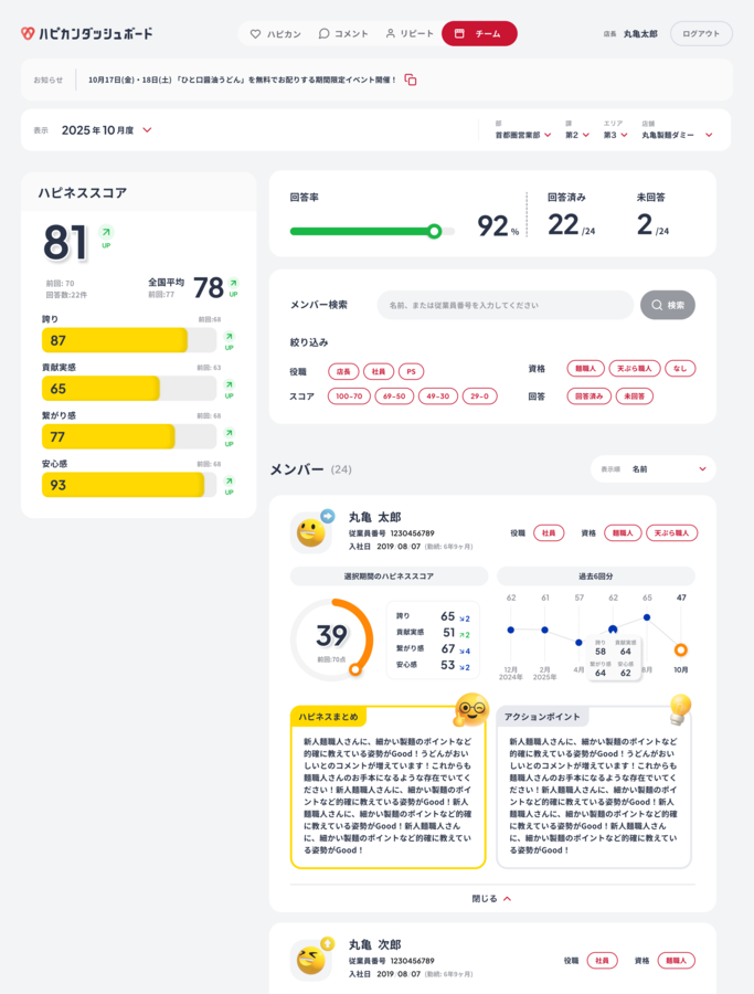 2025年7月より、アルサーガパートナーズ株式会社と共同開発した従業員向けの「ハピネススコア※2インタビュー」をこれまで3回実施してきました。直近では有効回答数が13,000件を超え、前回比で約3,000人増加するなど現場への浸透が進んでいます。また、ハピネススコアは店舗レベルで集約した数値も重要ですが、従業員個人レベルで把握することでより具体的に状況が把握でき、効果的なアプローチができるであろうとの仮説から、株式会社プレイドとの共同開発をさらに進めて生まれたのが「チームダッシュボード」です。