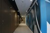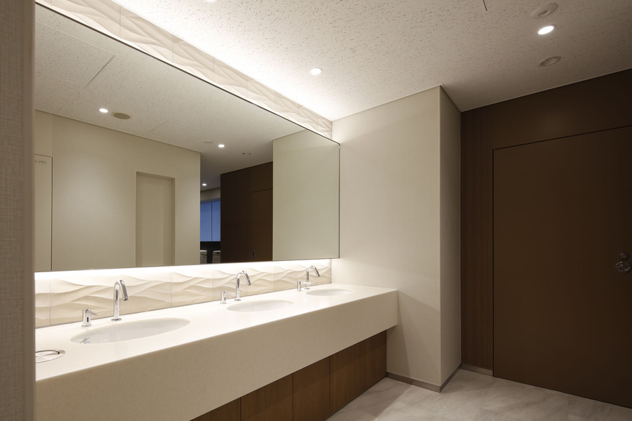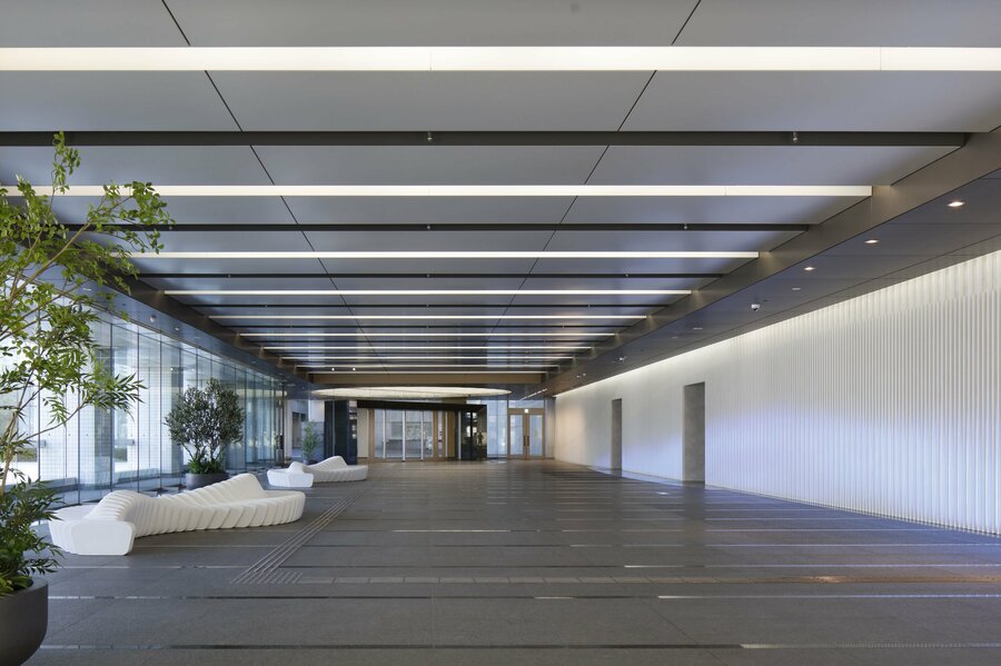 設計は、世界最大級の設計デザイン事務所であるゲンスラーが担当しました。2階のエントランスロビーには、ウォーターフロントの立地に合わせ、ダイナミックな波をモチーフにした壁面ルーバー(装飾壁)やベンチを設置し、洗練された空間で来館者を迎えます。壁面ルーバーにはLEDライトを組み込むことで、波を想起させるグラデーションを演出し、一日のサーカディアンリズム※3をアシストします。さらに時報に合わせて光を変化させることで四季の移ろいを表現し、人が集まり、記憶に残るオフィスエントランス空間にしました。また共用廊下には、漁網や使い古しカーペットなどを原料に用いた再生タイルカーペットや、環境に配慮した素材を積極的に活用し、一般財団法人建築環境・省エネルギー機構によるCASBEE不動産※4のSランクを取得しています。