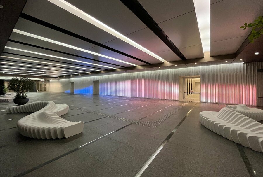 リニューアル対象範囲は、全体共用部分である2階エントランス外観、エントランスロビーのほか、当社がアセットマネジメントを受託する3階から15階のエレベーターホールやオフィス内廊下などです。2階エントランスロビーの壁面にはLEDを組み込んだルーバーを設置し、晴海というウォーターフロントの立地に調和したグラデーションにより波を表現しています。朝はエントランスから奥へ、夜は奥からエントランスへと、光が移ろう演出とし、サーカディアンリズムへの配慮を行っています。また、時報に合わせて、春は「桜」、夏は「花火」、秋は「紅葉」、冬は「雪」をモチーフに、四季の移ろいを照明で演出します。