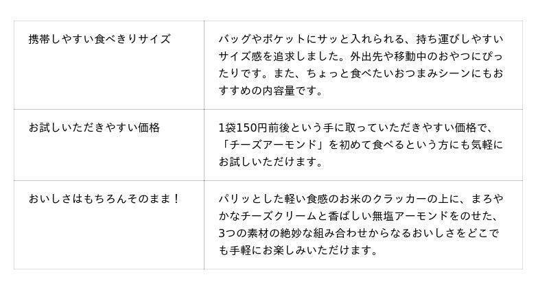 昨年11月にコンビニエンスストア限定で発売した「18g チーズアーモンド」は、「ちょっとだけ食べたい」「外出先で小腹を満たしたい」といったお客様のニーズにお応えする商品として、多くのご好評をいただいてまいりました。