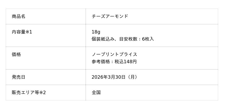 三幸製菓株式会社(本社:新潟県新潟市北区)は、2025年11月よりコンビニエンスストア限定で販売し好評をいただいた食べきりサイズの「18g チーズアーモンド」を、2026年3月30日(月)より全国発売いたします。