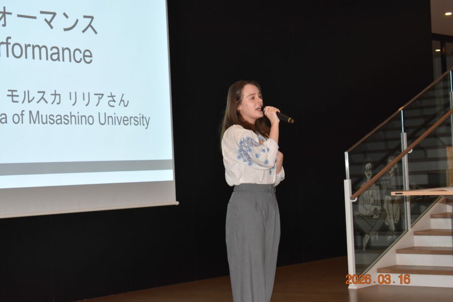 本イベントは、各自の日本での経験を振り返るとともに、将来を考える機会を作ることを目的としています。本年は本学を会場に3部構成で開催しました。ウクライナ、シリア、アフガニスタンだけでなく、日本の学生も参加し交流を図りました。第3部のレセプションパーティーでは、本学大学院を昨年9月に修了したリリア・モルスカさんが参加し、歌を披露しました。