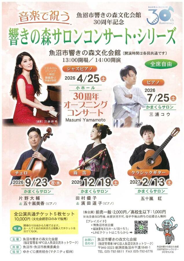 魚沼市響きの森文化会館の開館30周年を記念した「音楽で祝う 響きの森サロンコンサート」が、2026年度に5回シリーズで開かれる。オープニングは4月25日、長岡市出身のジャズピアニストMasumi Yamamoto=本名・山本真純=さんが出演する。