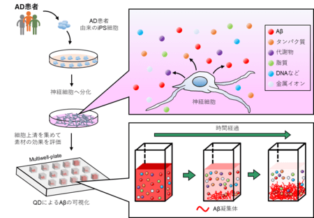 本研究では、室蘭工業大学が開発した量子ドット(QD)によるAβ凝集過程の可視化法を応用したタンパク質凝集抑制物質の微量ハイスループットスクリーニングシステム(特許第7166612号、PCT/JP2019/51077)と、株式会社カネカ 再生・細胞医療研究所のiPS細胞培養技術を組み合わせ、患者iPS細胞から分化誘導した神経細胞の培養上清中で凝集阻害物質をスクリーニングする新たなスクリーニング手法 High‑throughput screening technology for Aggregation Inhibitors of Diseased cell‑derived Aggregative Proteins (HaiDap)を開発しました。