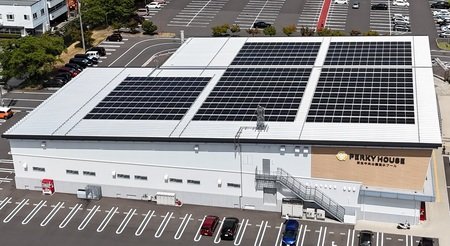 令和7年10月、温水プールの管理・運営を行うTCP共同事業者(民間事業者7社で構成する温水プールの指定管理者)が、自らの事業として施設の屋根に太陽光発電パネルを設置。あわせて、カーボンオフセットLPガスを導入しました。