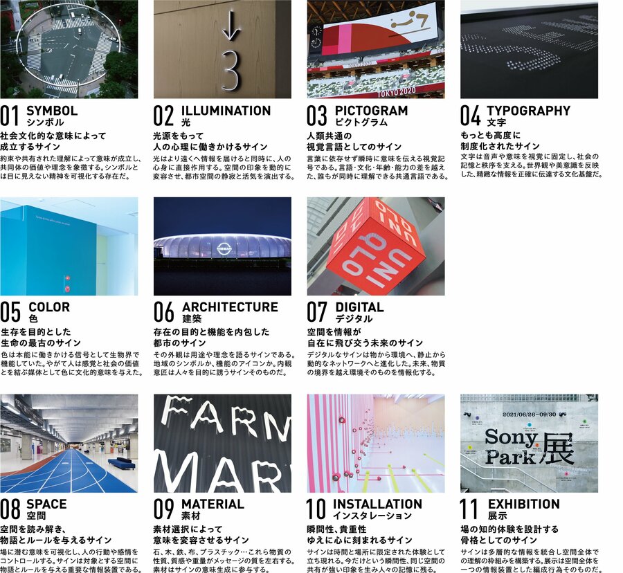 人が古来からコミュニケーションの手法として用いてきたサインの情報伝達表現の要素を、11のコンテクストに分類し、時代を彩った象徴的なプロジェクト77作品に焦点を当て、それぞれの作品のコンセプト、写真、映像、模型、モックアップなどから読み解いていきます。サインのもつ多面的な魅力と、社会との関係性の軌跡をその秀逸な多くのプロジェクトから辿ります。