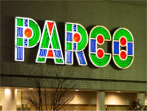 PARCOの象徴として受け継がれてきた、五十嵐威暢氏による通称「五十嵐ロゴ」。松本PARCOの外壁で実際に使用されていたネオンサイン「P」の実物を、デザインハブで公開します。あわせて、エントランスのガラス面で使用されていた、木と真鍮で制作された「五十嵐ロゴ」のドアノブも展示します。
