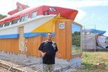 佐渡市の達者海岸で活躍していた海中透視船「シャーク号」を再生した一棟貸し宿「ハーバーベースシャーク」が小川地区にオープンした。初日のセレモニーには約50人が集まり、新生シャーク号のにぎやかな“航海”を期待した。