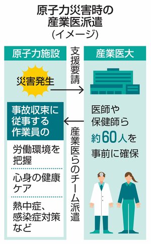 協定では原子力災害が発生すると、事業者が産業医大に支援を要請。同大は産業医らのチームを派遣する。チームは、高い放射線量下に重装備で働く作業員の労働環境を把握し、メンタルを含めた健康のケア、熱中症や感染症の対策に取り組む。同大は26〜28年度に60人程度の医師や保健師を確保する計画で、派遣に備え、産業医に原発を視察してもらう。全国の...
