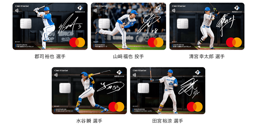 ファイターズの5選手(郡司 裕也選手、山﨑 福也投手、清宮 幸太郎選手、水谷 瞬選手、田宮 裕涼選手)の昨シーズンの名場面をモチーフとした限定デビットカード「FIGHTERS PLAYER’S DEBIT」の新デザインの発行を開始いたします。
