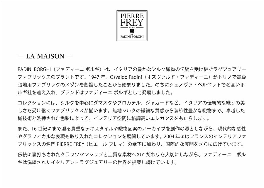 壁紙、インテリアファブリックス、インテリアアイテムの貿易および販売事業を展開する株式会社トミタ(本社:東京都品川区、代表取締役社長:富田亙正) は、イタリアの豊かなシルク織物の伝統を受け継ぐ FADINI BORGHI(ファディーニ ボルギ)による2年ぶりの新作ファブリックスコレクション18デザイン41点を3月31日より発売いたします。