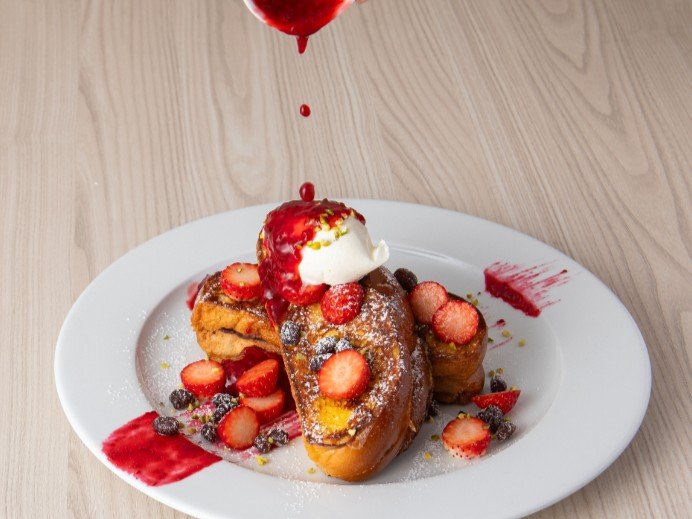 「小倉フレンチトースト」は、サラベス特製の卵とバターの香りがふんだんに広がるふわふわの“ハッラーブレッド”に、上品な甘さの小倉餡をサンドし、アパレイユにたっぷり浸して香ばしく焼き上げてた春限定のフレンチトースト。ほどよい塩気を加えたマスカルポーネホイップを贅沢にトッピングし、ストロベリーソースと合わせることで、甘みの中に爽やかな酸味が広がります。