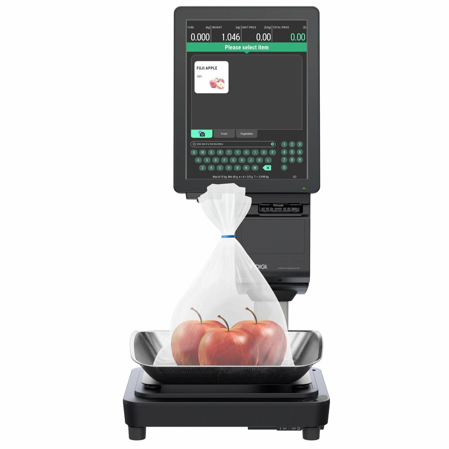 青果用AIスケール「SM-6000AI」は、内蔵カメラとAI技術を活用した画像診断により、計量する商品の種類を自動判別するセルフサービススケールです。利用者が秤に商品を置くだけで、画面上にその商品情報を呼び出し、計量結果に基づくバーコードラベルを発行できます。
