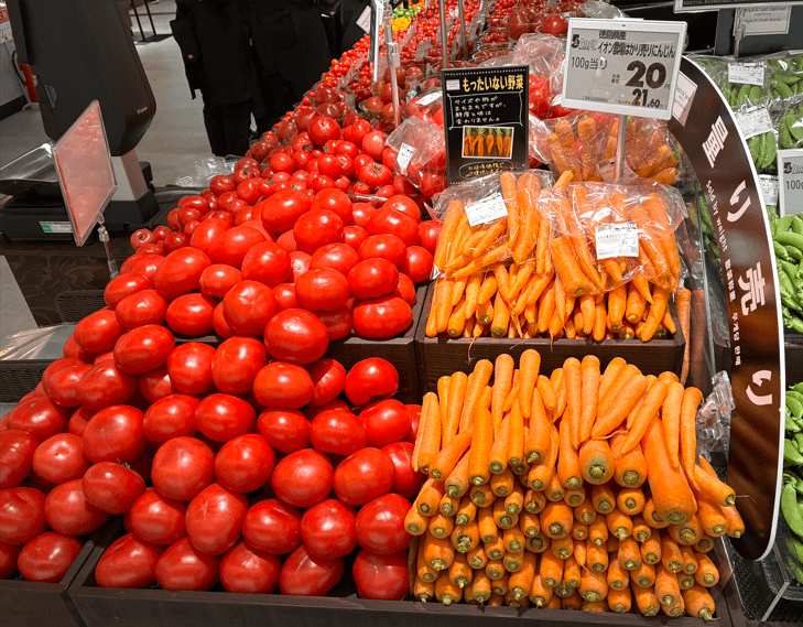 「イオンスタイル津田沼 South」の生鮮食品売場では、トマトやニンジン、スナップエンドウ、マッシュルームなどを、量り売りで販売しています。特に、イオン農場で栽培されたトマトとニンジンは、形や大きさが不揃いな野菜を「もったいない野菜」として、フードロス削減のためにお値打ち価格で販売しています。お客様は、用途や必要量に応じた野菜を選ぶことができ、利便性が向上するとともに、家庭での食品ロスを防ぐことができます。