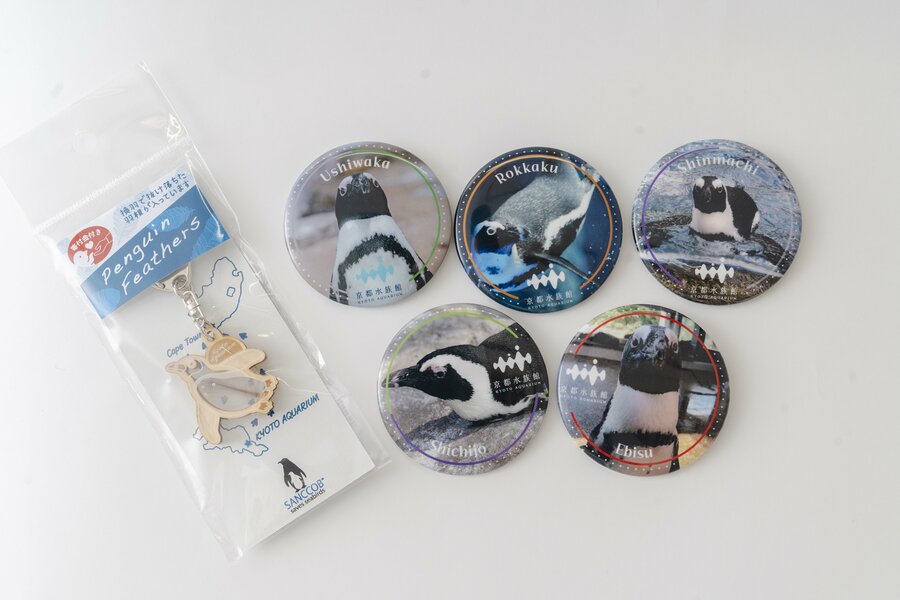 寄付金付き「ケープペンギンの羽根キーホルダー」と「ペンギン缶バッジ」も発売