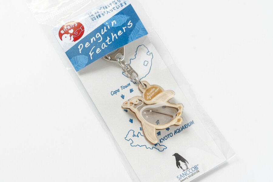 年に一度の羽の生え変わりの「換羽(かんう)」の時期に抜け落ちたケープペンギンの羽根を入れたキーホルダーを販売します。ご購入いただくと1個につき100円が「SANCCOB」に寄付されます。