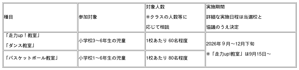 2026年のドリーム・スクール・キャラバンでは、前年に引き続き「走力up!教室」、「バスケットボール教室」、「ダンス教室」の、全3種目の教室を開催します。各教室では、プロスプリントコーチ、現役プロ選手、プロダンサーなど、その道のプロフェッショナルの皆さんが講師を務め、素晴らしい技術の披露や、実践的な指導を行います。これらの教室を通じて、スポーツへの興味を深めたり、プロの技術に驚き感動したり、走るタイムの向上を実感して喜びを感じたりすることで、参加する子どもたちに、さまざまな学びや夢のきっかけを提供します。