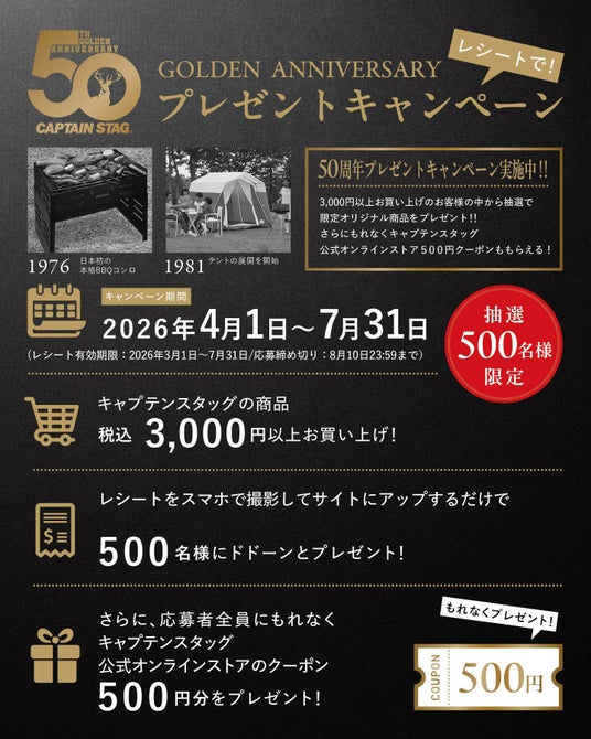スマートフォンでレシートを撮影し専用サイトから応募するだけで、抽選で合計500名様に50周年限定オリジナル商品をプレゼントします。さらに、応募者全員にキャプテンスタッグ公式オンラインストアで使える500円クーポンを進呈します。