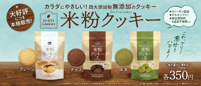 昨年販売した米粉クッキーが好評だったことを受け、4月3日から、全国のくら寿司にて再販売いたします。本商品は、四大添加物無添加(※1)・ヴィーガン認証・グルテンフリー・特定原材料8品目不使用(※2)で、ココナッツが香るサクッとした食感の「プレーン」、ココアとアーモンドの香ばしさが調和した「チョコ」、抹茶のほろ苦さと深い香りがまろやかに広がる「抹茶」の3種類をご用意。お席のタッチパネルから注文でき、お持ち帰りも可能です。アレルギーが気になる方やお子様にもおすすめです。