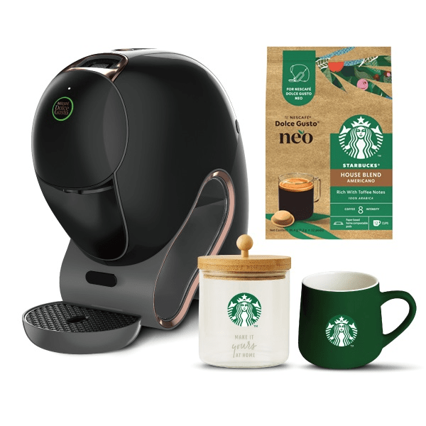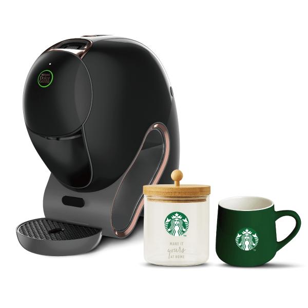 ブロンズカラーをあしらった新色のコーヒーメーカー「ネスカフェ ドルチェ グスト ネオ カフェシェア」に、スターバックス® のロゴ入りアクセサリー(キャニスター、マグカップ)や「ネスカフェ ドルチェ グスト ネオ」専用コーヒーポッド「スターバックス® ハウス ブレンド」を組み合わせたセットです。家族や友人と共有(シェア)するコーヒー時間をより豊かにし、特別感のある“おうちカフェ”を演出します。