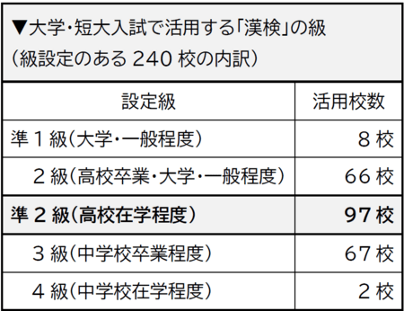 また、活用対象として具体的な級を設定している大学・短大は240校で、そのうち準2級(高校在学程度)以上と設定している大学・短大が97校と最も多いことがわかりました。