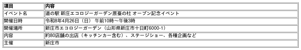 山形県新庄市に市内初の道の駅として誕生した「道の駅 新庄エコロジーガーデン原蚕(げんさん)の杜」。来る**2026年4月26日(日)**に、道の駅のグランドオープンを記念したイベントを開催します。午前10時から午後3時まで、新庄市エコロジーガーデンを会場に、地域内外から多くの来場者をお迎えし、多彩な催しで賑わいを創出します。タイミングがよければ、桜並木と菜の花畑の鮮やかな光景が観られるかも!?