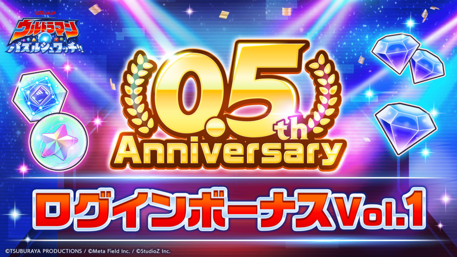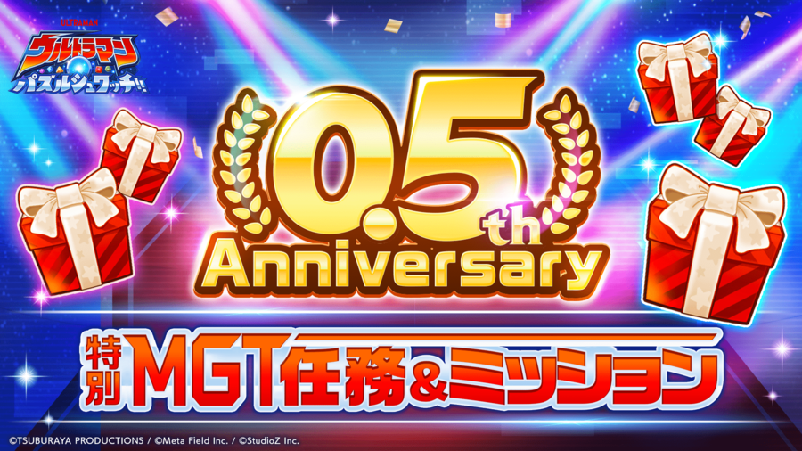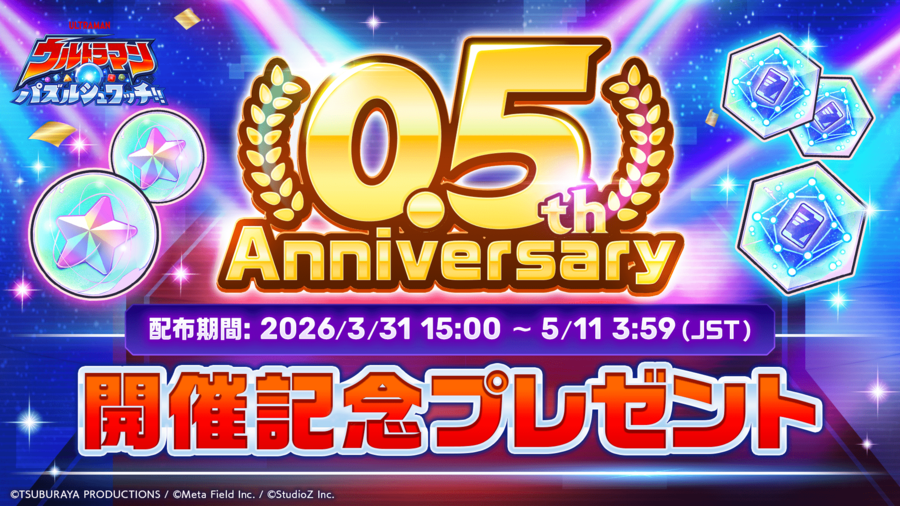 メタフィールド株式会社(本社:東京都渋谷区、代表取締役社長:大塩 忠正、以下「メタフィールド」)は、StudioZ株式会社(本社:東京都港区、 代表取締役CEO:古瀬祥一、以下「StudioZ」)との共同事業として配信中のスマートフォン向けアプリゲーム『ウルトラマン パズルシュワッチ!!』において、2026年3月31日(火)より0.5th Anniversary(ハーフアニバーサリー)キャンペーンを開催いたします。